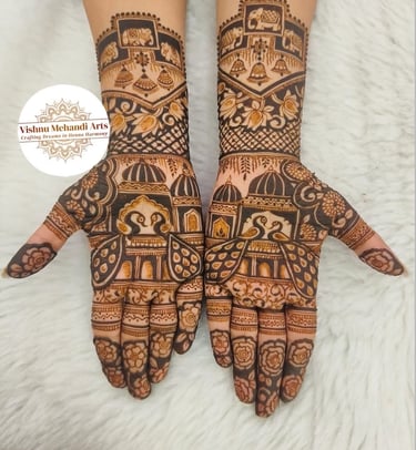 At Vishnu Mehandi Arts, we weave the ancient art of Mehndi into a contemporary tapestry of elegance. Nestled in the heart of Gurugram, our studio celebrates cultural traditions and personalized artistry. With a passion for intricate designs, We transform hands into canvases, creating henna masterpieces that tell unique stories. Guided by tradition and fueled by creativity, our team takes pride in providing an immersive experience that blends the richness of heritage with modern allure. Step into our world, where each stroke reflects our commitment to timeless beauty and craftsmanship.