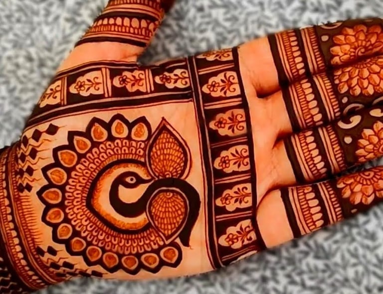 Hidden wrist patterns, solid fingertips, and delicate designs inspired by peacock feathers for a stunning overall look.